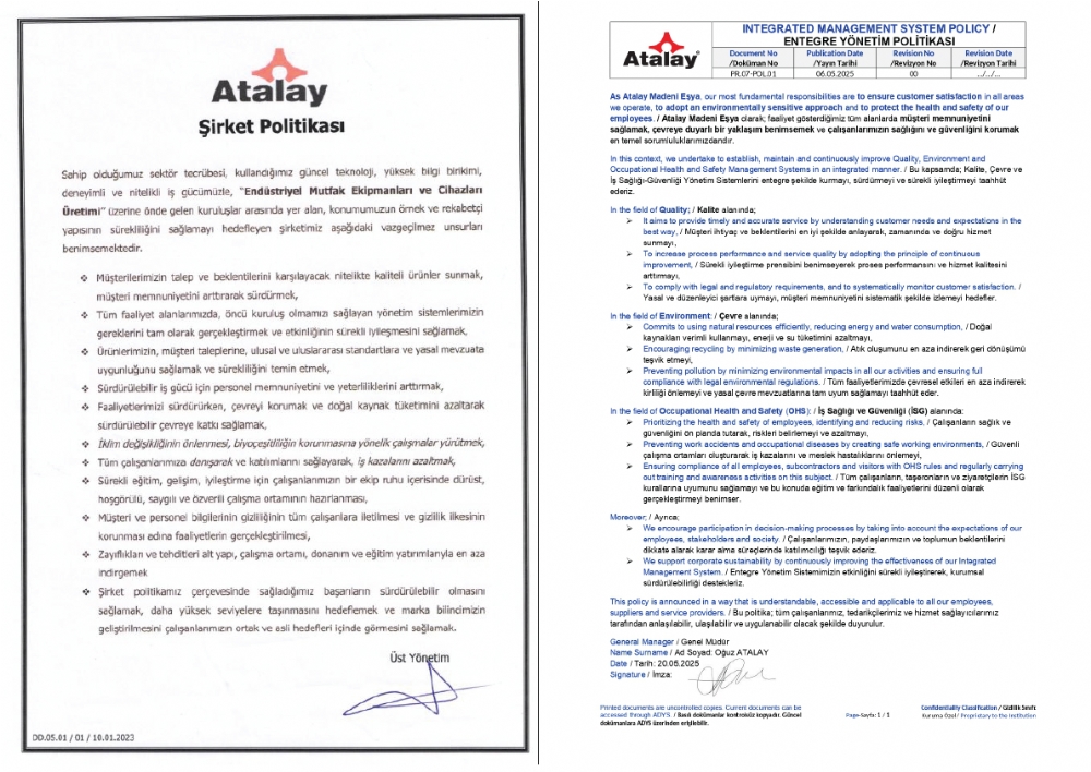 Atalay Madeni Eşya olarak, sektör tecrübemiz, güncel teknoloji kullanımı ve deneyimli ekibimizle, “Endüstriyel Mutfak Ekipmanları ve Cihazları Üretimi” alanında lider kuruluşlar arasında yer almaktayız.